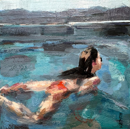 Through vivid color and balanced composition, I revisit moments of celebration and reflection. Artists like Titian, Fragonard, the Nabis, the Bay Area Figurative painters, and Hockney have shaped the way I think about color, intimacy, and how people inhabit a space. I imagine my subjects stepping out of their routines—dressed, engaged, and connected—even if only briefly. I often hint at what happens after the gathering, as in the bikini top draped on a chaise in Mischief, or the lone swimmer in Côte d’Azur, needing solitude to reflect on the night before.